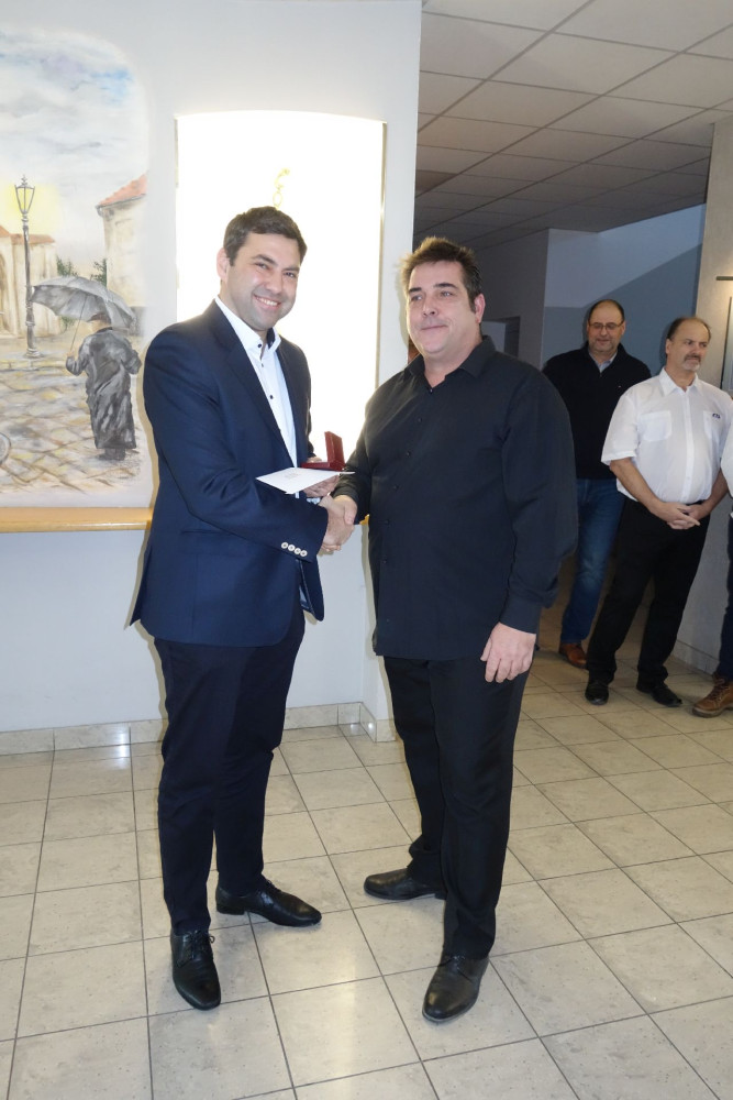 Na snímku v popředí vlevo Mgr. Ing. Pavel Hanák, předseda představenstva, vpravo vyhodnocený řidič Radovan Šrámek